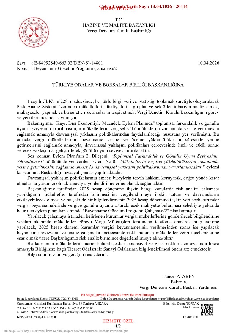 T.C. Hazine ve Maliye Bakanlığı Vergi Denetim Kurulu Başkanlığı tarafından gönderilen 10.04.2026 tarihli ve 14801 sayılı yazıda; (Ek.1)