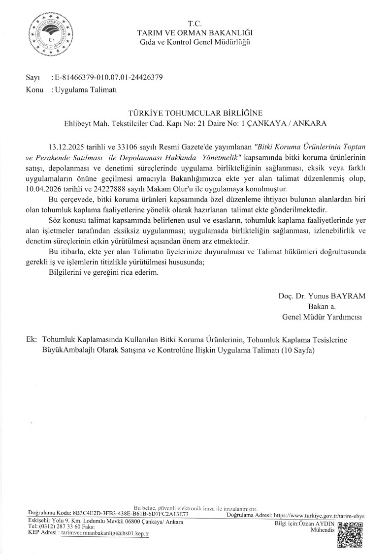 TOHUMLUK KAPLAMASINDA KULLANILAN BİTKİ KORUMA ÜRÜNLERİNİN, TOHUMLUK KAPLAMA TESİSLERİNE BÜYÜK AMBALAJLI OLARAK SATIŞINA VE KONTROLÜNE İLİŞKİN UYGULAMA TALİMATI